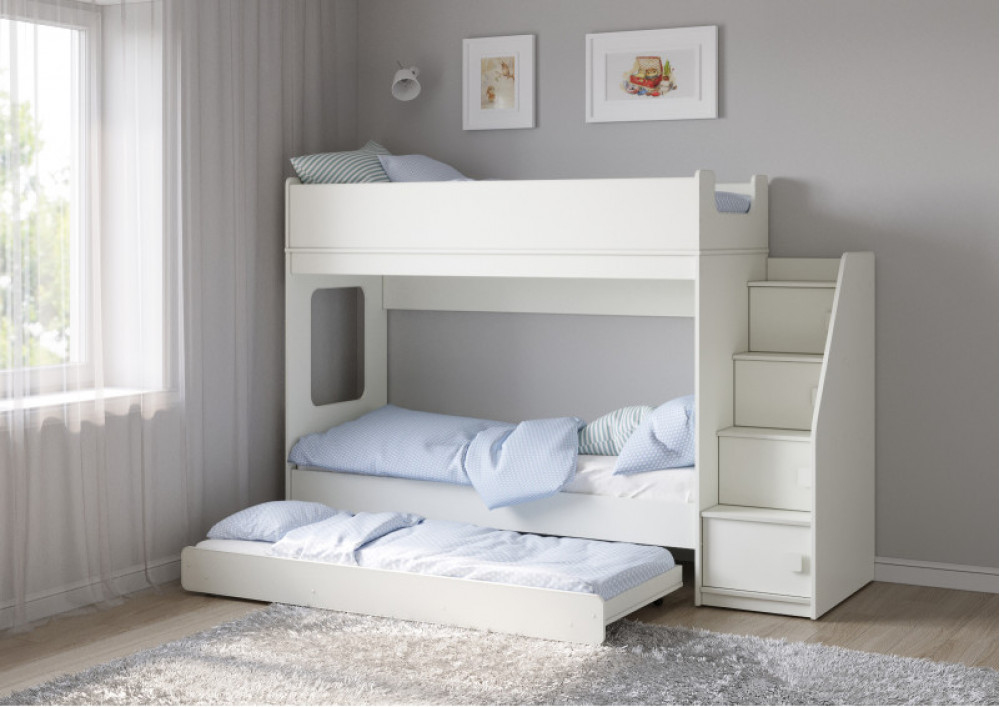 Нижнее спальное место легко выдвигается и задвигается, ребенок сможет управляться с ним. Для данного ящика использованы усиленные колёса.
